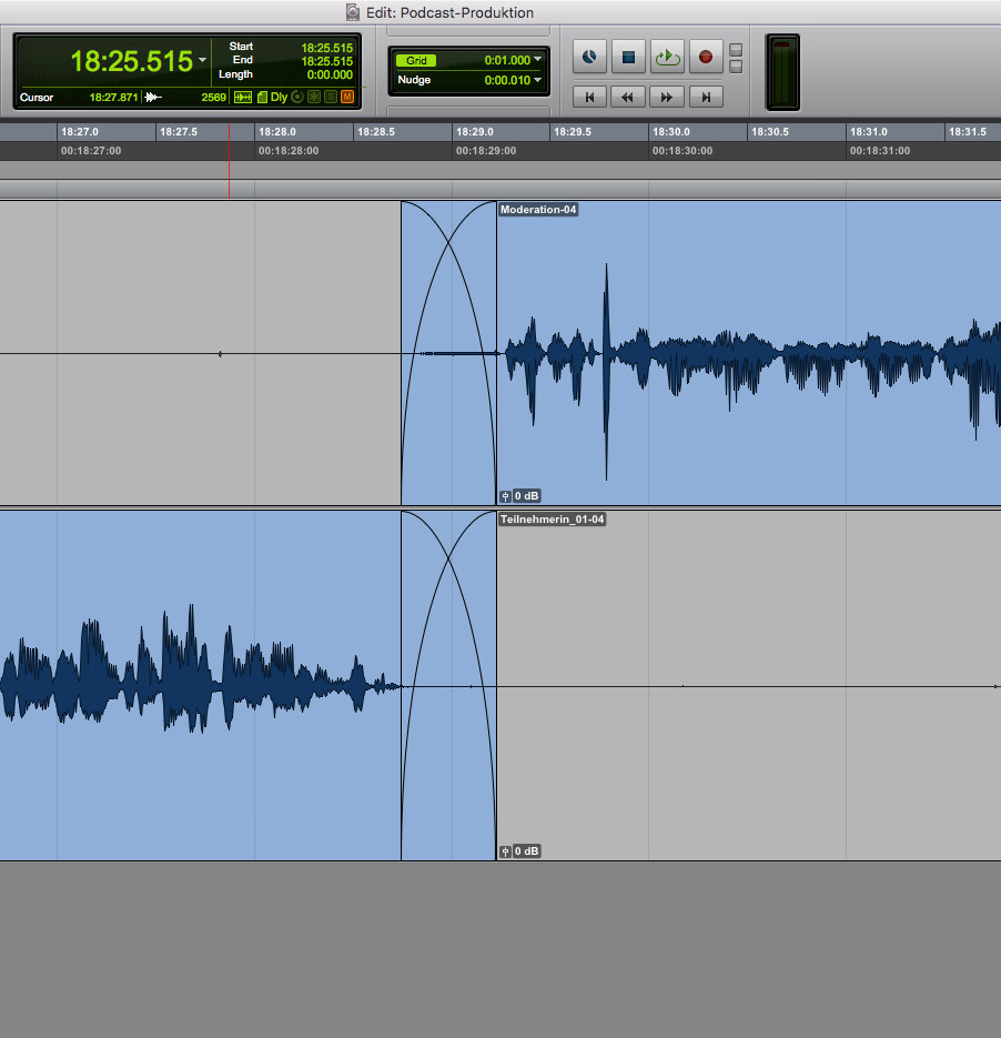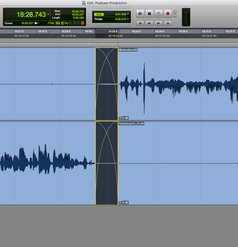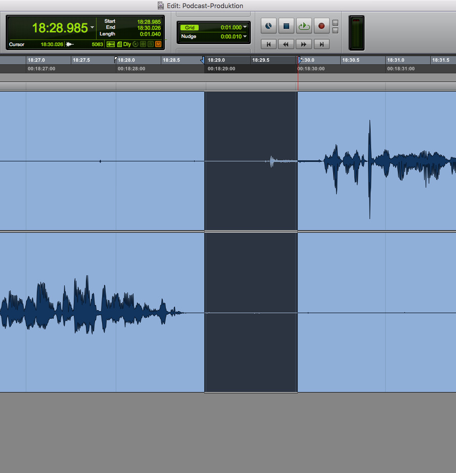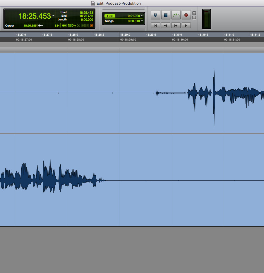 Das eben beschriebene Problem des Wortwechsel-Ping-Pongs kann man im Schnitt meist ganz gut lösen. Denn Remote-Produktionen haben einen unschlagbaren Vorteil: Es gibt kein Übersprechen auf das jeweils andere Mikrofon. Wenn zwei Menschen mit zwei Mikrofonen in einem Raum sitzen nehmen beide Mikrofone immer beide Gesprächsteilnehmer auf. Zwar ist die Stimme von Person 1 aufgrund von Abstand und Ausrichtung der Mikrofone sehr viel leiser auf dem Mikrofon von Person 2 und umgekehrt, aber das Übersprechen (auch Crosstalk oder Bleeding genannt) ist immer da. Verschiebt man die Spuren zeitlich zueinander beginnt man das sonst nahezu zeitgleiche Übersprechen als hörbares Echo wahrzunehmen.